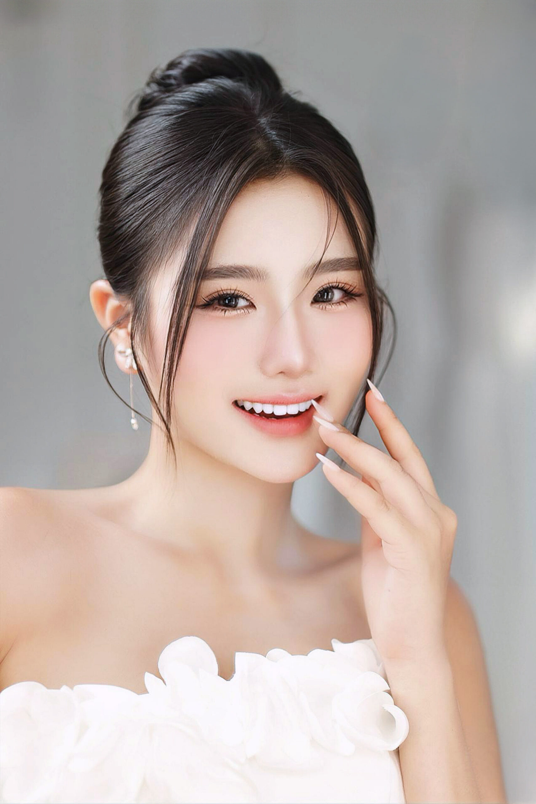 Búi thấp kết hợp với vài lọn tóc xõa mềm mại là lựa chọn hoàn hảo cho makeup cô dâu tone nhẹ nhàng hoặc lãng mạn. Kiểu tóc này vừa sang trọng, vừa thanh lịch, dễ phối hợp với veil hoặc các phụ kiện tóc, giúp cô dâu tỏa sáng trong lễ cưới và chụp ảnh studio.